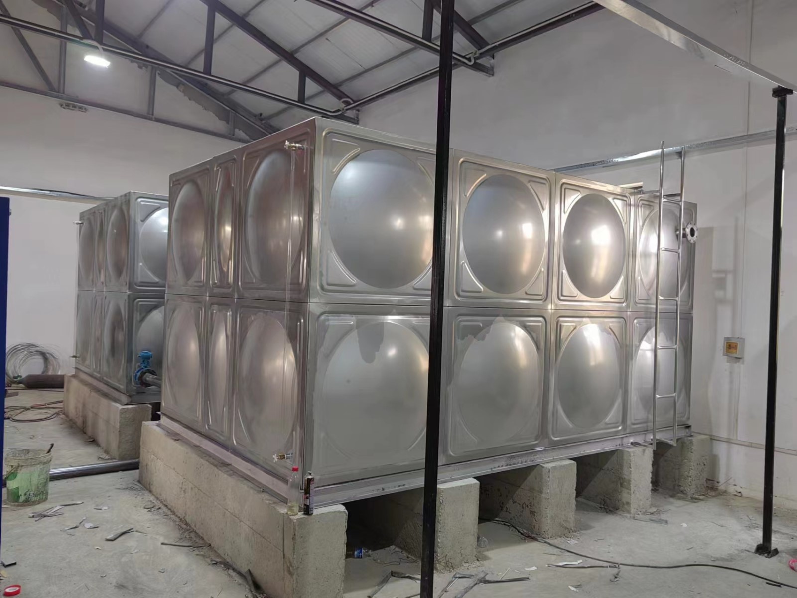 不銹鋼水箱施工方便快捷:標準沖壓板塊1000×1000、1000×500、500×500mm隨意裝配現場組裝焊接,無需吊裝設備。