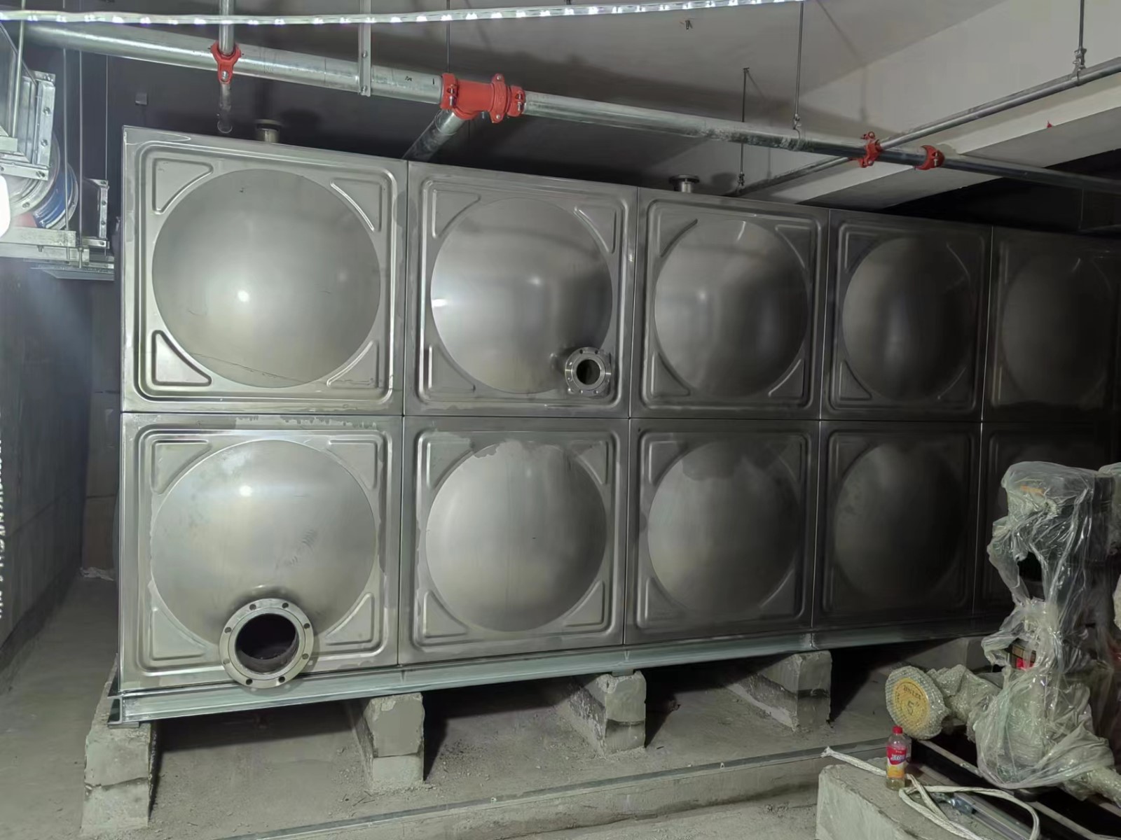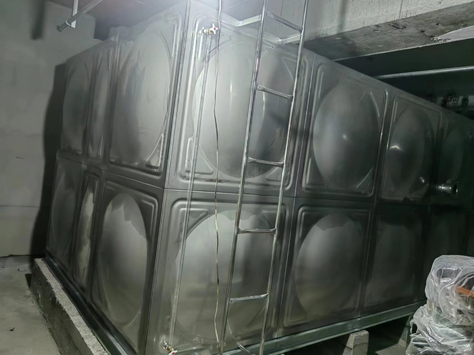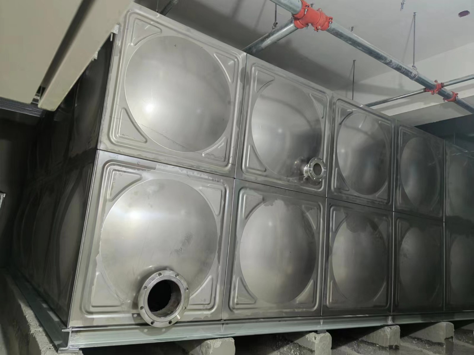 我司承接的北京市大興區(qū)舊宮合生項目,不銹鋼生活給水及中水水箱,已安裝試水完畢。不銹鋼焊接水箱,是指容器本體用不銹鋼板沖壓帶一定凹凸形狀,使之鋼度大大提高,再焊接成薄殼箱體的新型水箱,是目前國內(nèi)較先進(jìn)、較美觀、較適用的水箱,其結(jié)構(gòu)精巧、合理、先進(jìn),用材省,可在民用及工業(yè)建筑中廣泛采用,是儲存、調(diào)節(jié)用水的理想設(shè)備。