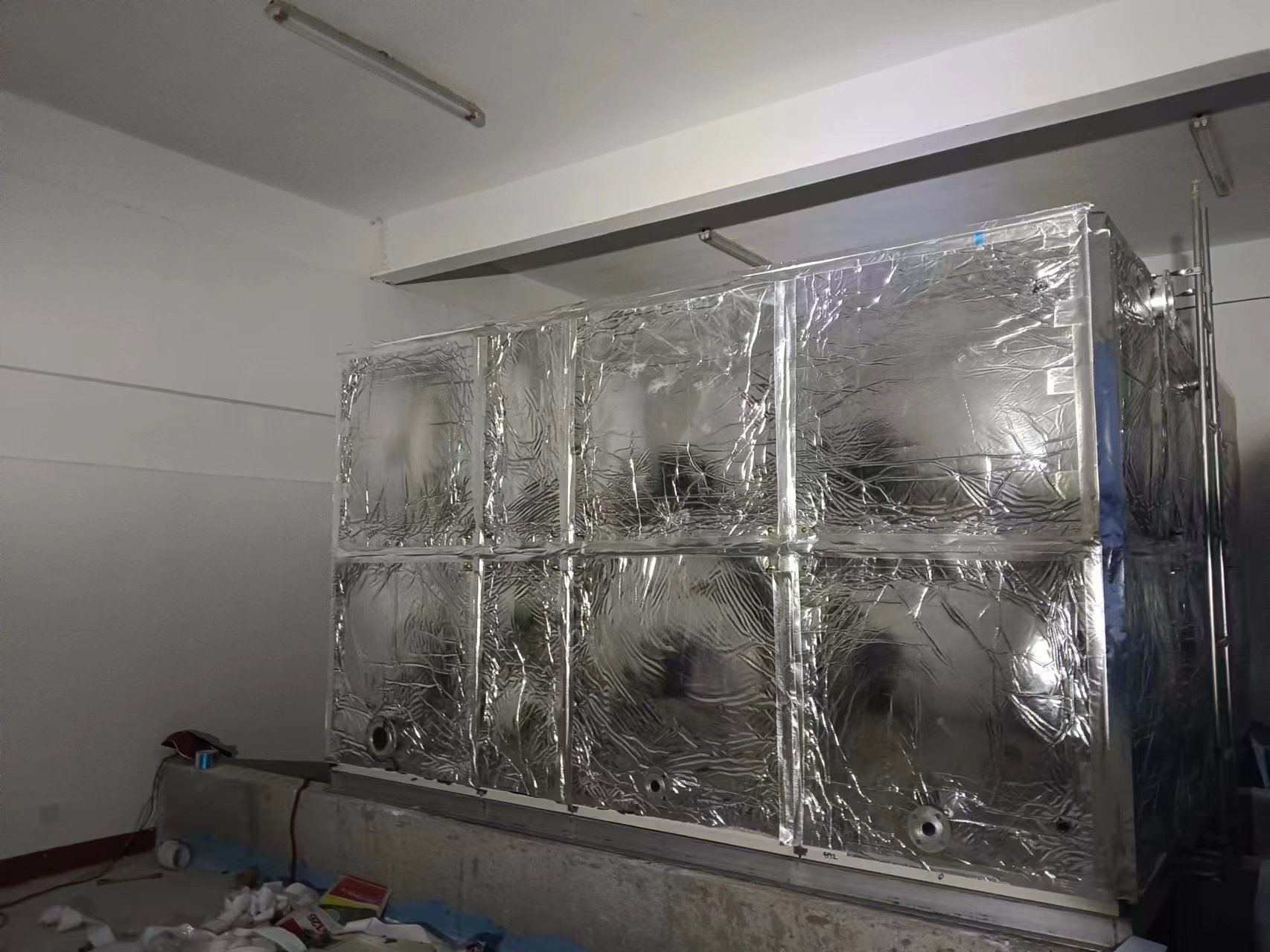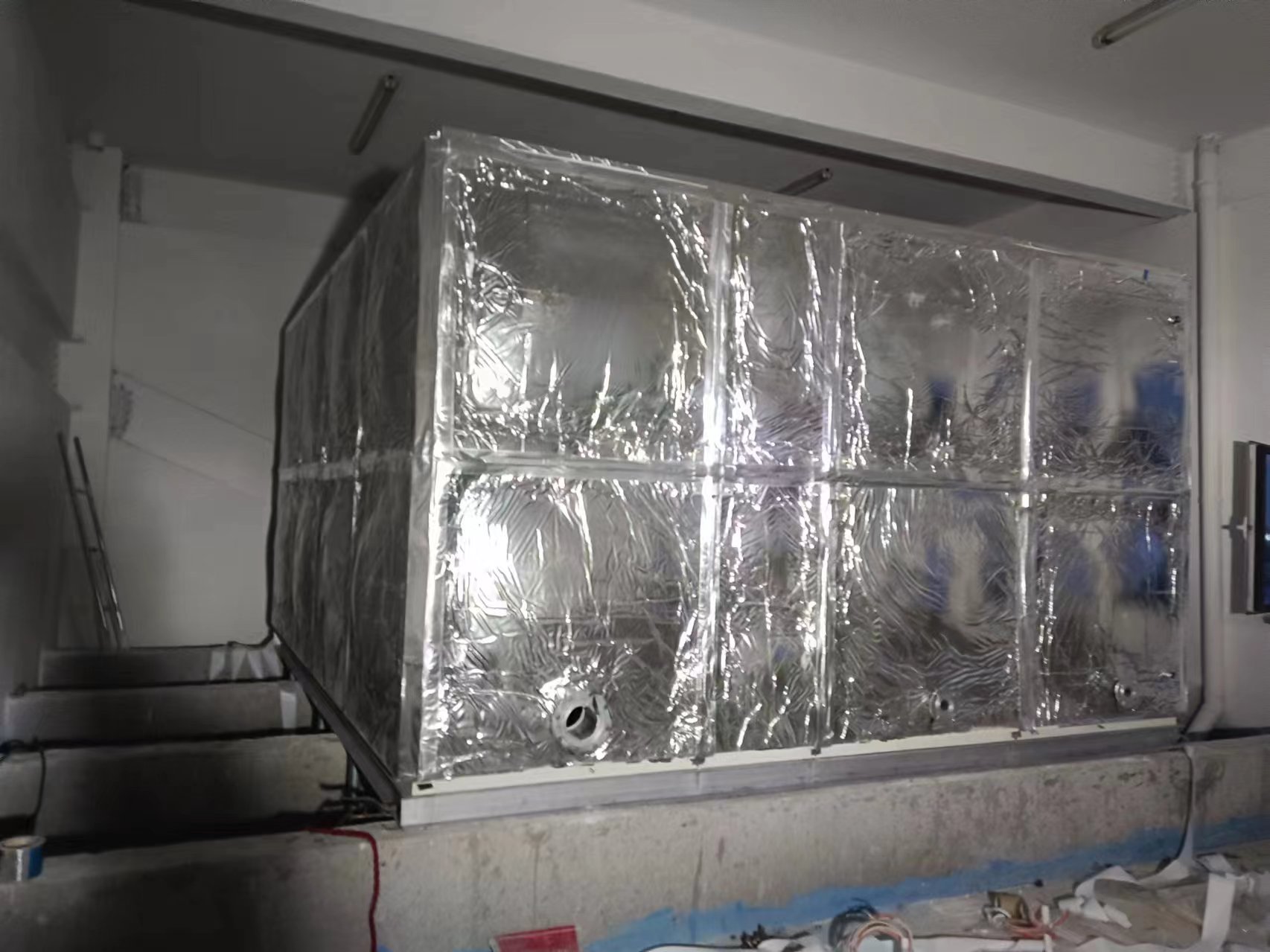 我司承接的山東省菏澤市東明縣春明中學消防水箱項目,已安裝試水完畢。玻璃鋼水箱整體由好的SMC水箱板拼裝而成,造價低。此水箱內部采用SMC玻璃鋼水箱,外部采用橡塑保溫外加201外殼,起到良好的保溫效果及完美的外觀。